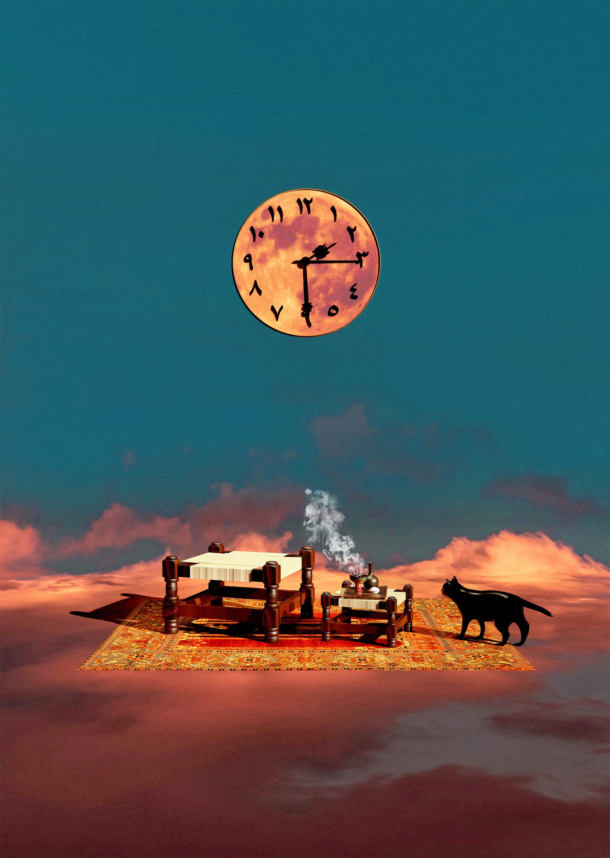 For this piece Rayan renders a very familiar Sudanese informal setting, with ‘bambar’s (wooden framed seats, strung with rope) a Jebena (East African coffee set) and bakhoor (burning incense) all in the sky. It imagines a futuristic setting that doesn’t neglect the existing Sudanese way of life.